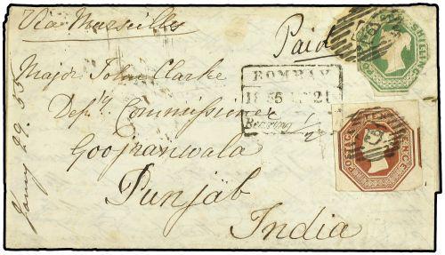 1854 Envelope to INDIA bearing embossed issue SG 54, 1/- green (cut) and SG 57, 10d brown (superb margins) tied by LONDON obliterator, routed via Marseille with boxed BOMBAY BEARING arrival in black. A very fine item.
