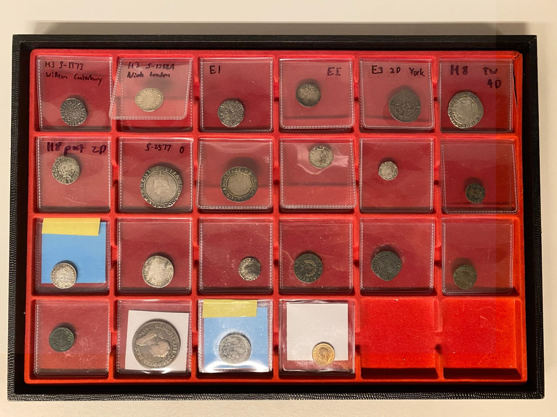 GREAT BRITAIN: LOT of 22 coins, many English hammered silver, including England (14): 2 Henry III AR pennies, 2 Edward I AR pennies, 1 Edward III AR halfgroat, 2 Henry VIII coins (incl. a Thomas Wolsey AR groat), 2 Elizabeth I silvers (AR shilling; AR sixpence, holed), 3 Charles I coins (incl. two silvers: rosa sina spina halfgroat; portrait penny), 1 Charles II (AR threepence), 1 William III (AR sixpence); Scotland (2, incl. a Charles I AR 2 shillings); Ireland (4, incl. a George III AR 30 pence token 1808); plus two later machine-struck coppers; most in average circulated conditions, some better, many identified; retail value $500, lot of 22 pieces.