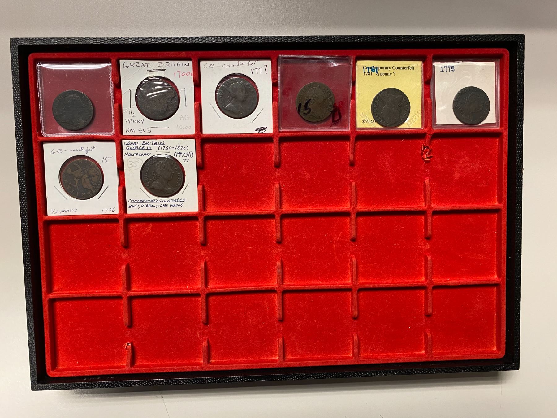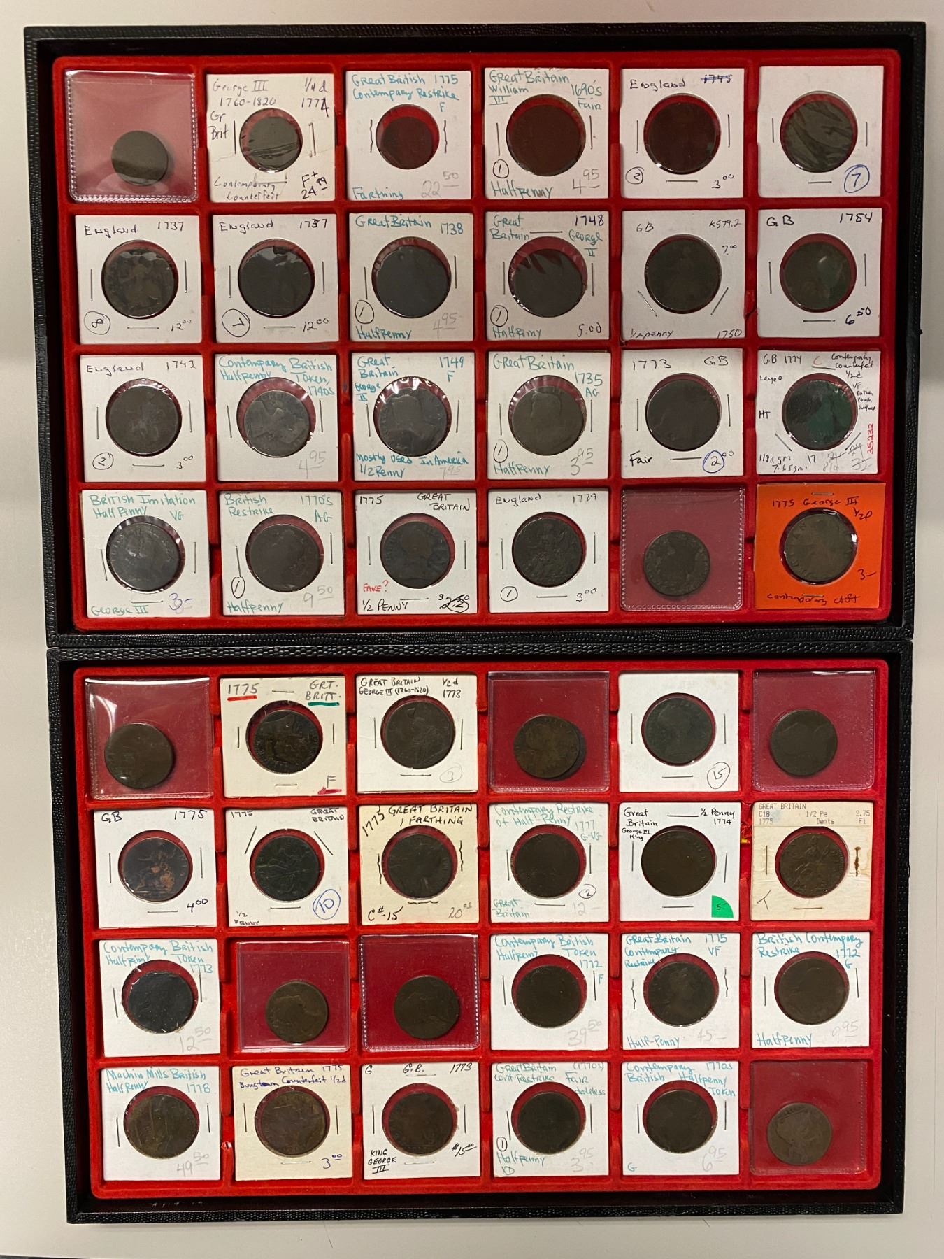 GREAT BRITAIN: LOT of 56 coins, all contemporary imitations or very worn genuine pieces, including George III farthings (3 pcs), William III halfpennies (2), George II halfpennies (11), and George III halfpennies (40); average circulated grades, with a few better, in consignor's 2x2 holders, viewing recommended; retail value $700, lot of 56 pieces.