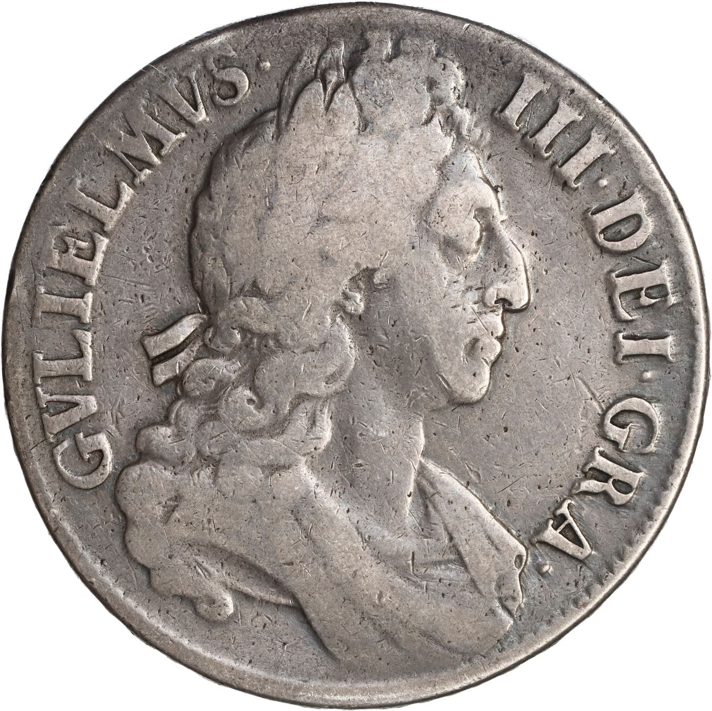 GREAT BRITAIN, London, crown, Willliam III, 1696, OCTAVO on edge. Sp-3470; KM-486. 29.36 grams. Deeply toned VG with bold bust, edges a bit flat in areas.