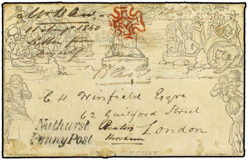 1840 Mulready envelope one penny cancelled by red MALTESE CROSS with NUTHURST PENNY POST hand-stamp and HORSHAM datestamp in blue on reverse addressed to LONDON with arrival on reverse. Very fine item.