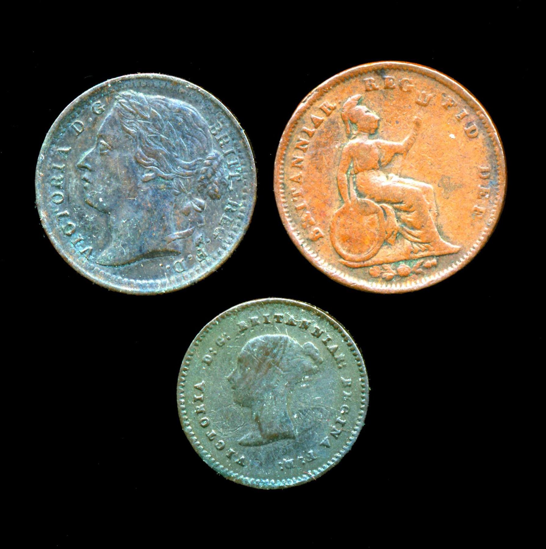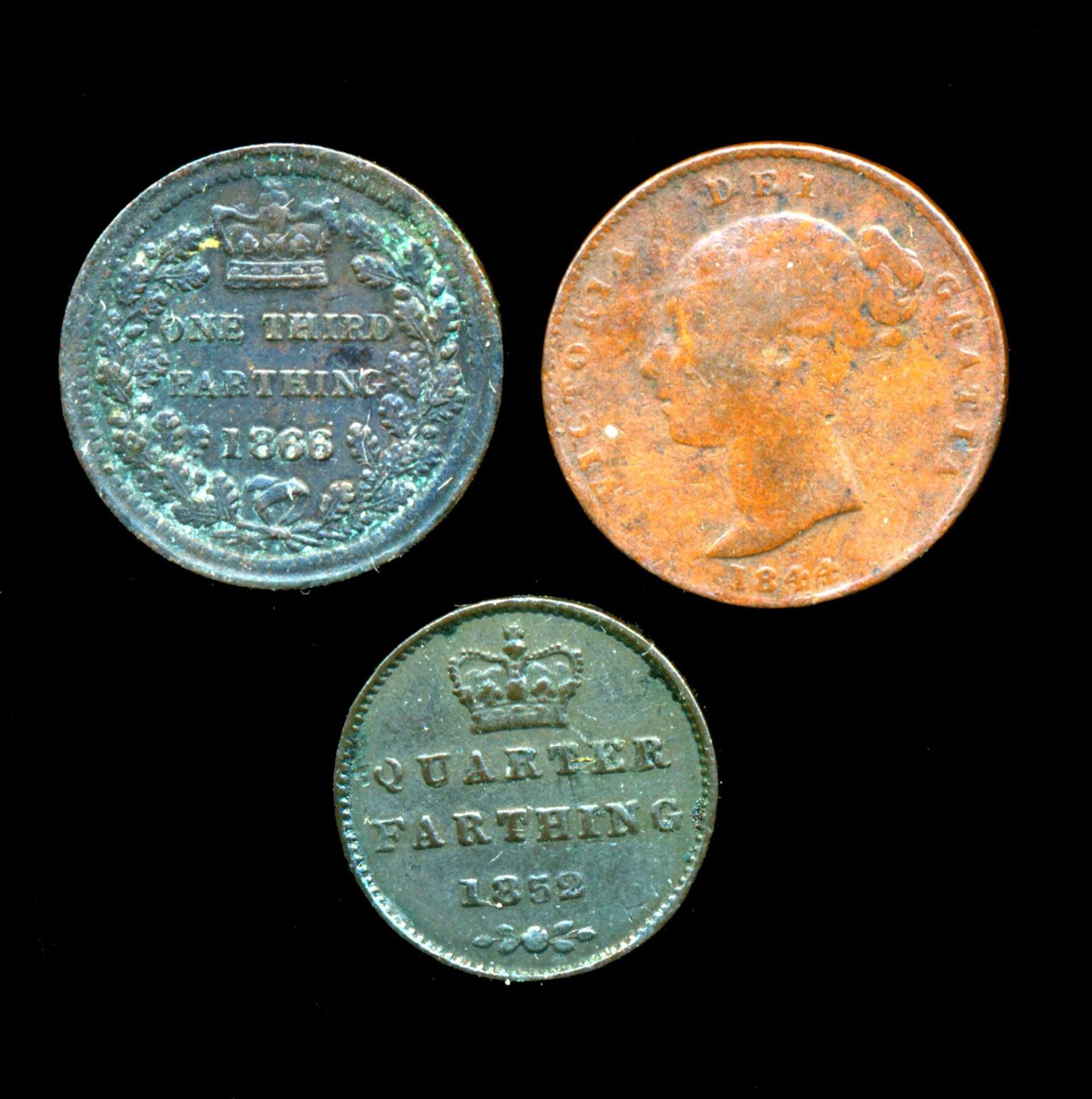 1852 KM# 737 1/4 Farthing F, 1844 KM# 743 1/3 Farthing F, 1866 KM# 750 1/3 Farthing EF.