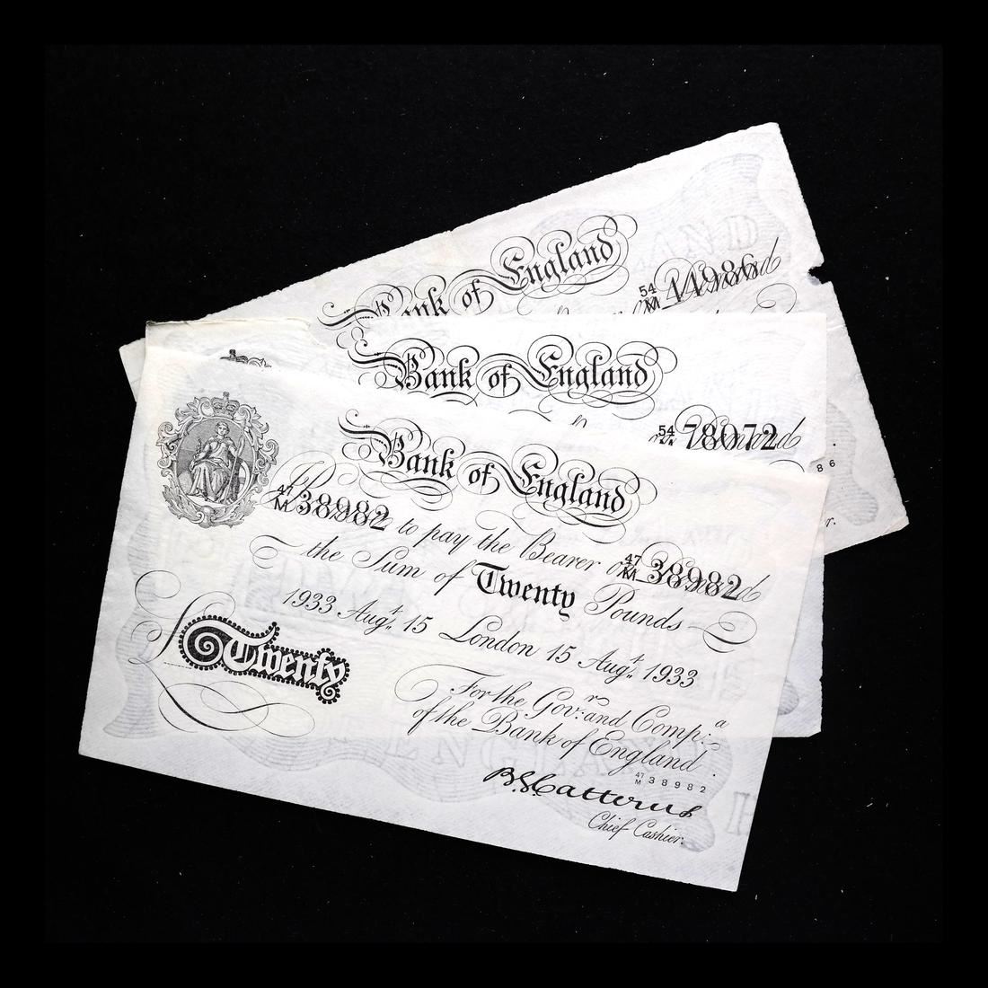 Three (3) examples of the 20 forgeries of Pick #330 and #337 produced by the Jewish prisoners at Sachsenhausen concentration camp, includes dates of 15 August 1933 and 7 June 1937 (2), sound and Very Fine to About Uncirculated.