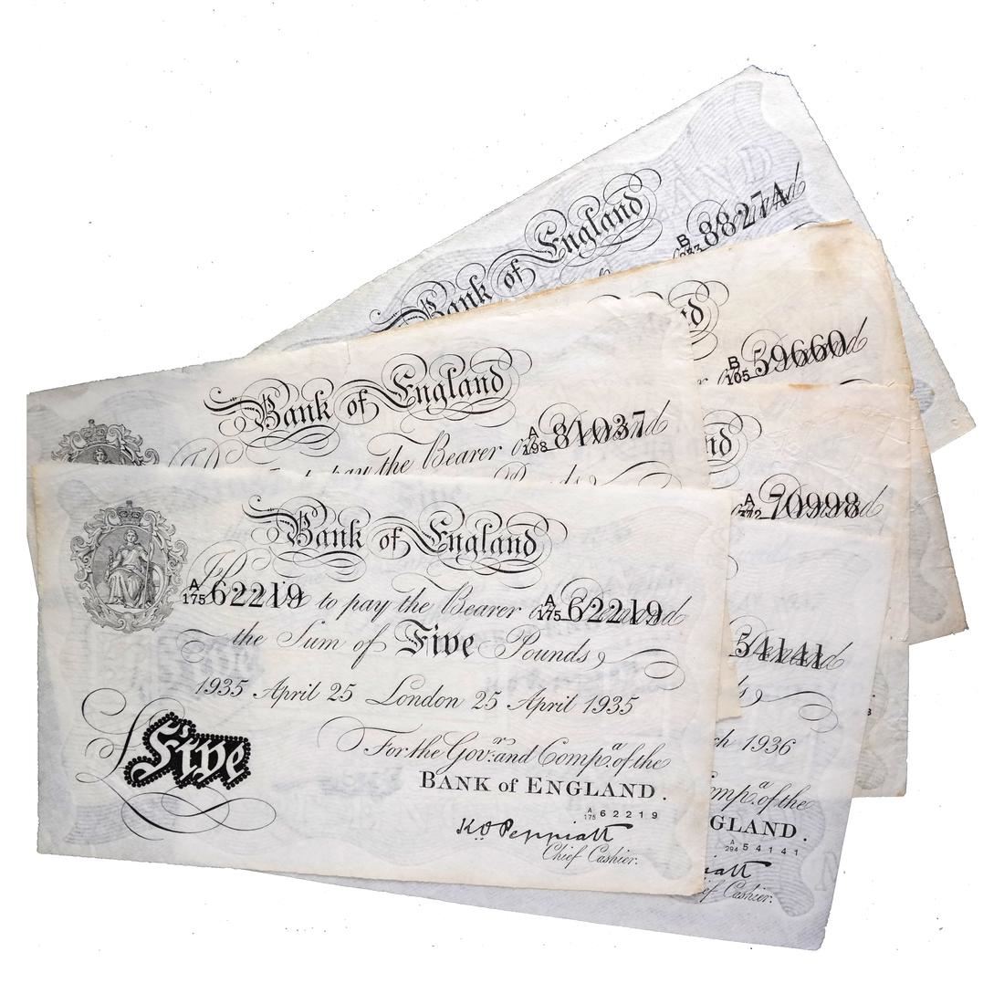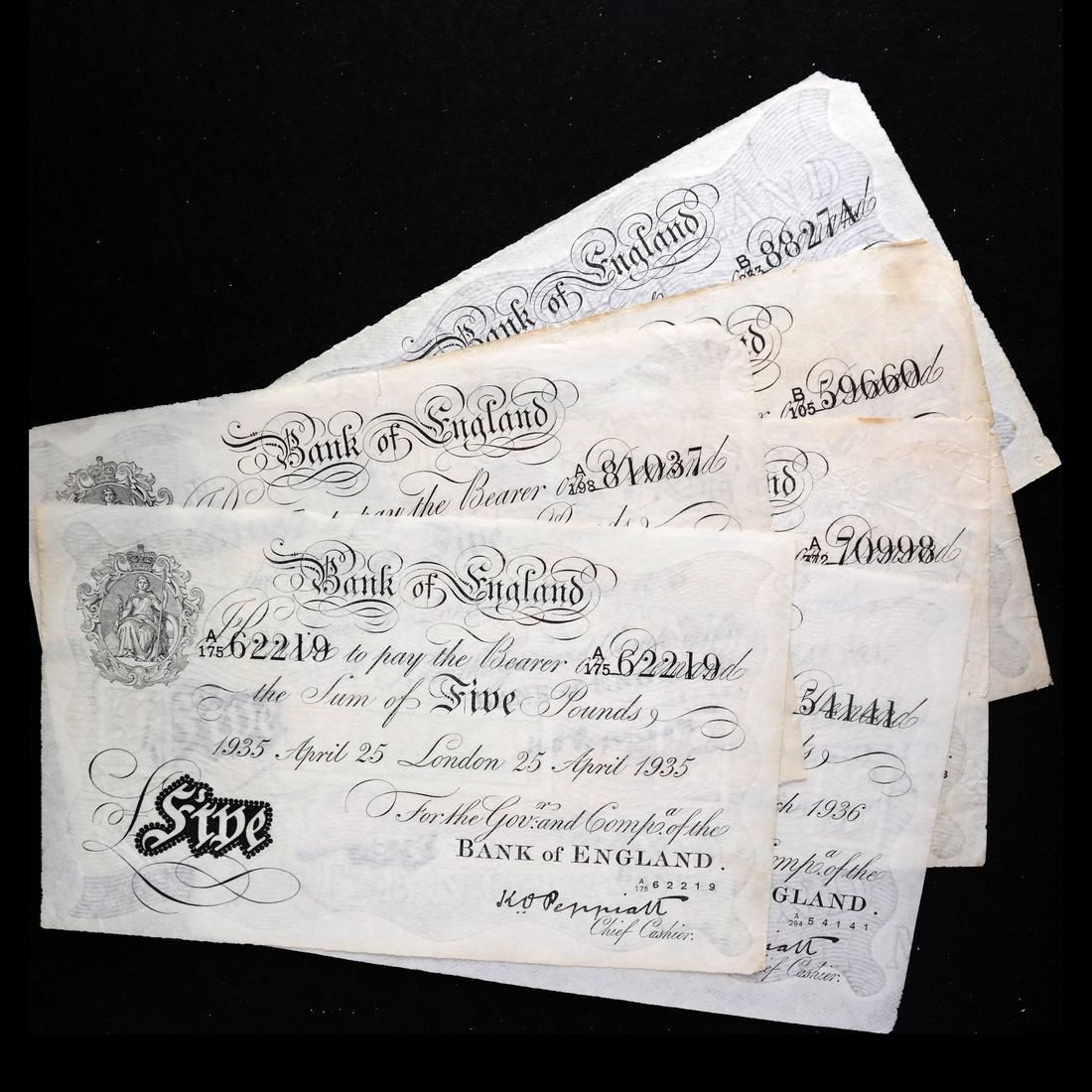 Six (6) different examples of the 5 forgeries of Pick #335a produced by the Jewish prisoners at Sachsenhausen concentration camp, includes dates of 25 April 1935, 25 June 1935, 12 March 1936, 22 February 1937, 24 May 1937, and 11 June 1938, generally sound and Very Fine to About Uncirculated.