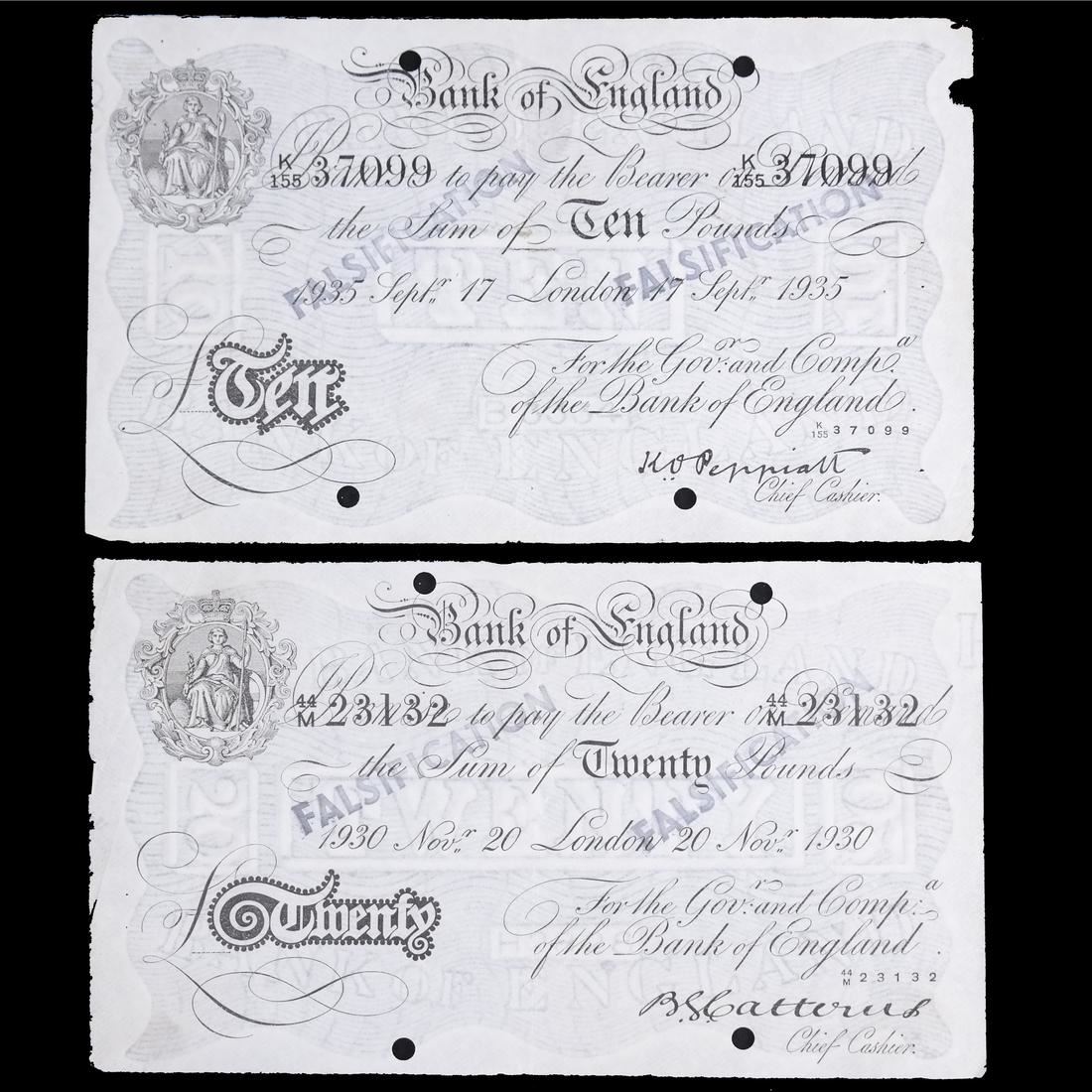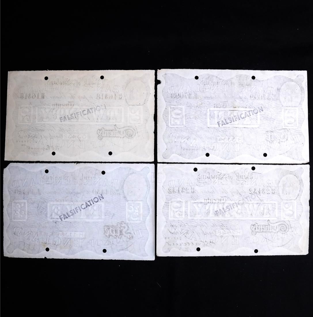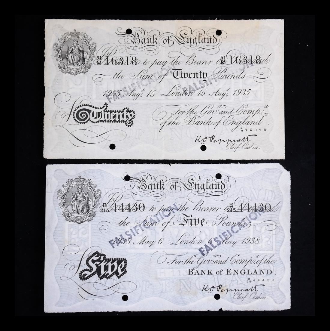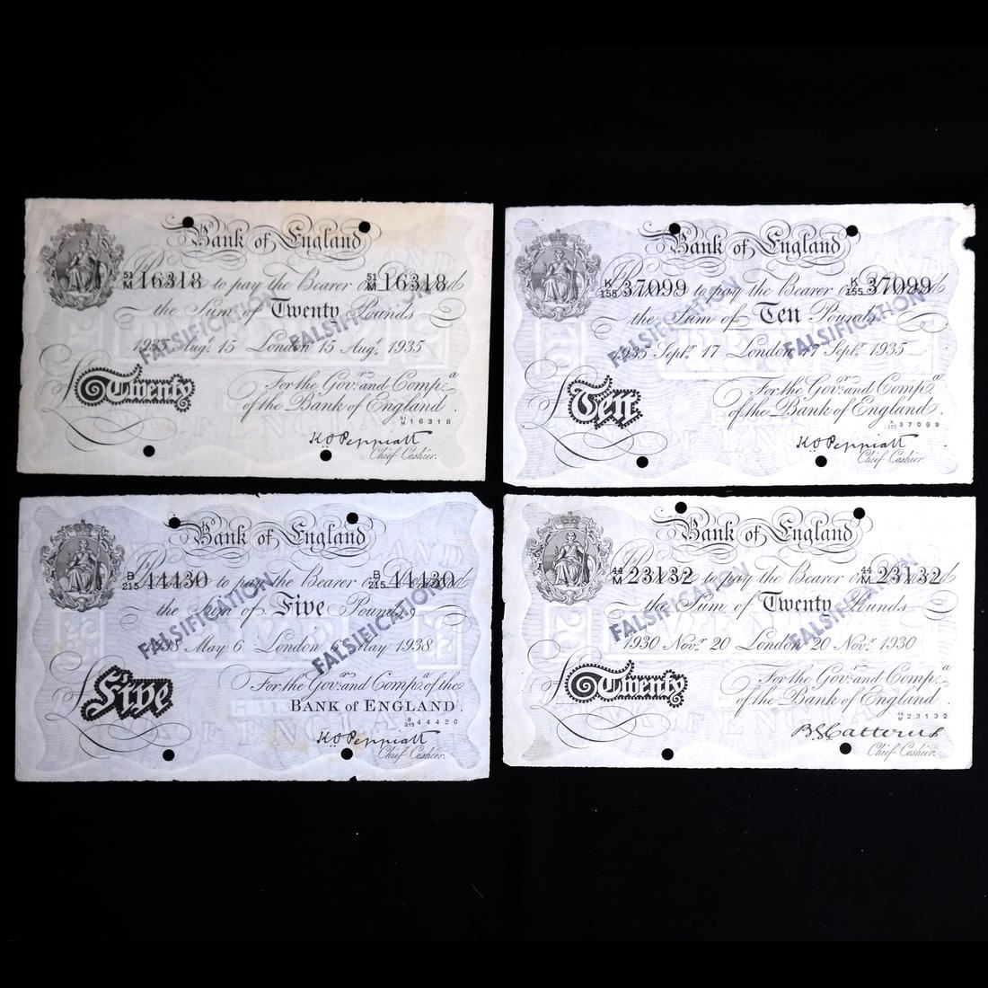 Four (4) different examples of the forgeries produced by the Jewish prisoners at Sachsenhausen concentration camp, includes 5 6 May 1938 serial #44430, 10 17 September 1935 serial #37099, 20 20 November 1930 serial #23132, and 20 15 August 1935 serial #16318, each is marked FALSIFICATION on front and back, and bears four punch holes, generally sound and Very Fine to About Uncirculated.