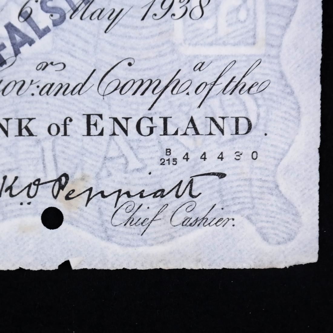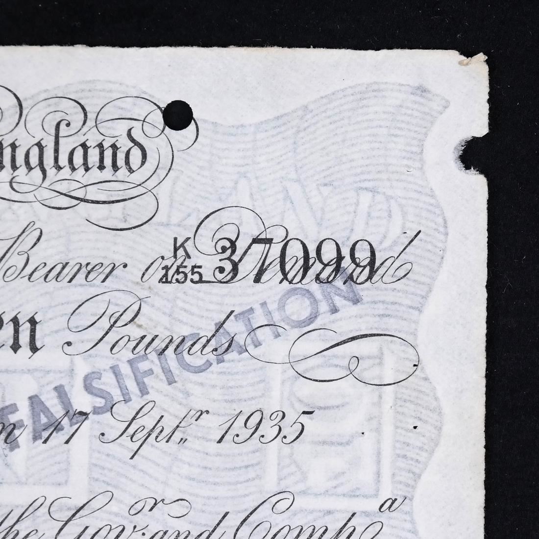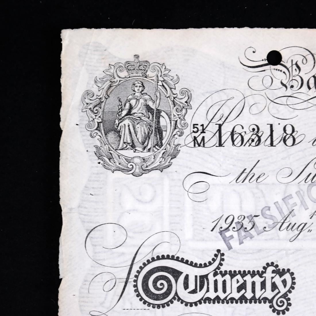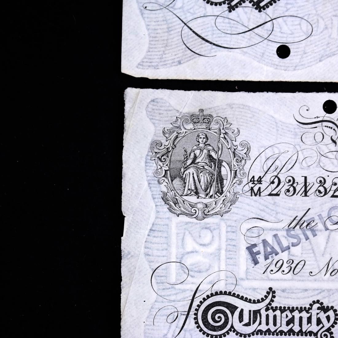 Four (4) different examples of the forgeries produced by the Jewish prisoners at Sachsenhausen concentration camp, includes 5 6 May 1938 serial #44430, 10 17 September 1935 serial #37099, 20 20 November 1930 serial #23132, and 20 15 August 1935 serial #16318, each is marked FALSIFICATION on front and back, and bears four punch holes, generally sound and Very Fine to About Uncirculated.