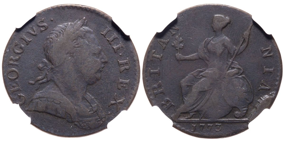 1/2 Penny 1773. KM.601. Reverse die break @ 5:00. NGC graded Choice Fine-12 Brown.