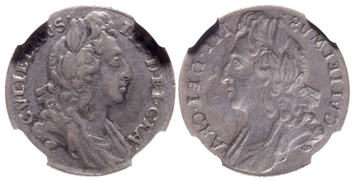 6 Pence undated, William III 1695-1700. KM.496.1. Mirror Brockage on reverse. NGC graded About Unc-55. An exceptional error from the Kril Collection.
