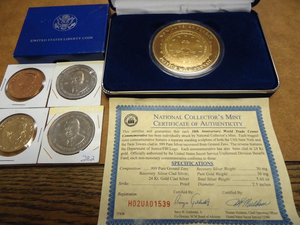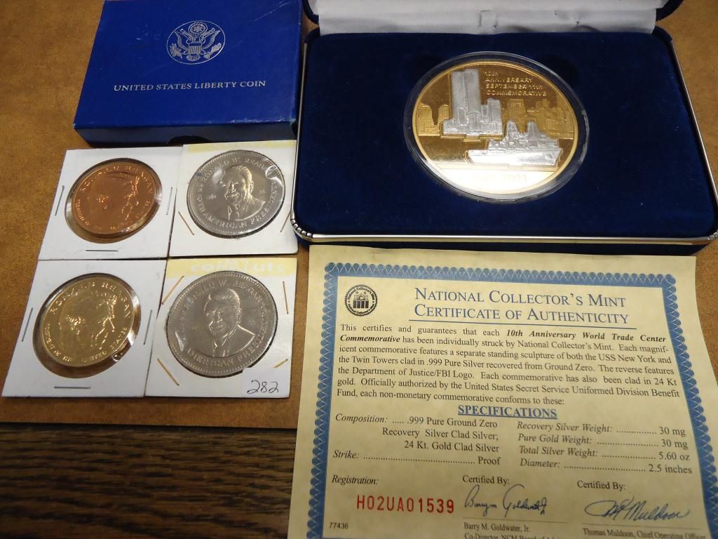 HIGHLIGHT OF THIS GROUP IS A TENTH ANNIVERSARY WORLD TRADE COMMEMORATIVE ROUND WITH THE USS NEW YORK AND TWIN TOWERS CLAD IN .999 PURE SILVER RECOVERED AT GROUND ZERO TOTAL SILVER IS 5.6 OUNCES, 1986-S LIBERTY HALF DOLLAR AND FOUR OTHER