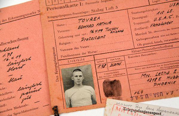 Luft Stalag III prisoner #671 1st. Lt. Ed Tovrea original POW camp file,German camp Luft III identification tag with his U.S.A.A.C. Dog Tag, also 3 Luft 3 letters home to his family including interestingly one in Spanish which Lt. Tovrea was learning while in camp.