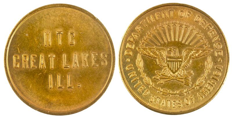 DEPARTMENT OF DEFENSE / (Spread Eagle holding arrows in wreath below stars and rays above) / UNITED STATES OF AMERICA // NTC / GREAT LAKES / ILL. Brass/Bronze 23mm Cunningham IL200 (page107) Listed as Movie Token