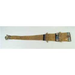 GREAT LAKES INDIAN BEADED RIFLE SCABBARD. Wonderful beaded scabbard of fine brain tanned velvety leather, 39-1/2” long with a flap and fringe at the toe. There are two bands of beaded black trade cloth around the middle with 2” fringe facing toward the heel. The beads are pink, blue, brown, green and red on the upper band in scallop pattern with the same color combinations, plus white and yellow, on the lower band. The open end of the scabbard is decorated with large patterns of flowers in the same colors with a band of brown velvet around the opening. CONDITION: About excellent. Some minor mothing to the black cloth and minor losses of beads at the open end of the scabbard. Colors remain strong and bright. 4-46117 JR519