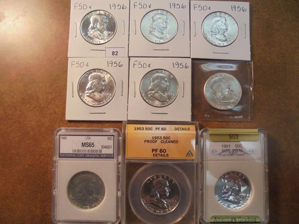 GREAT LOT OF 9 FRANKLIN HALF DOLLARS SEE DESC. 5-1956 UNC'S, 1963 UNC, 1948 IN NCGS SLAB UNC, 1953 A