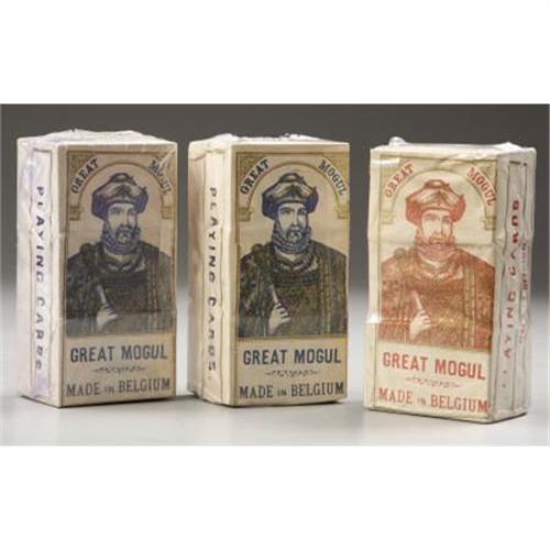 <B>“GREAT MOGUL PLAYING CARDS</B></I> - Imported from Belgium in the 1880's, these are 3 sealed bricks of 6 decks each with red and blue graphics on the wrappers.<BR><BR><b>Shipping:</b> Miscellaneous Collectibles, Larg (<a target="_blank" href="http://www.heritageauctions.com/common/shipping.php">view shipping information</a>)
