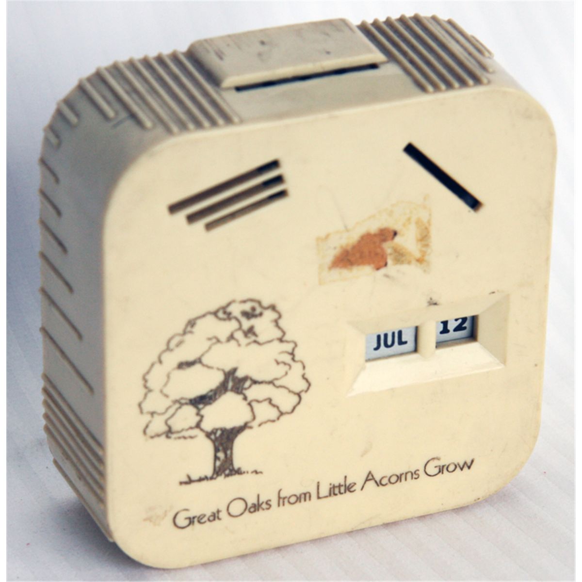 GREAT OAKS FROM LITTLE ACORNS GROW’. A rectangular Coin Calendar bank. Four coin slots on front, one on top. 10cm x 10cm x 3 1/2cm. Cream coloured plastic. Day/Date counter on front. Maker-M.A. Gerett Corr., Milwaukee. VF.