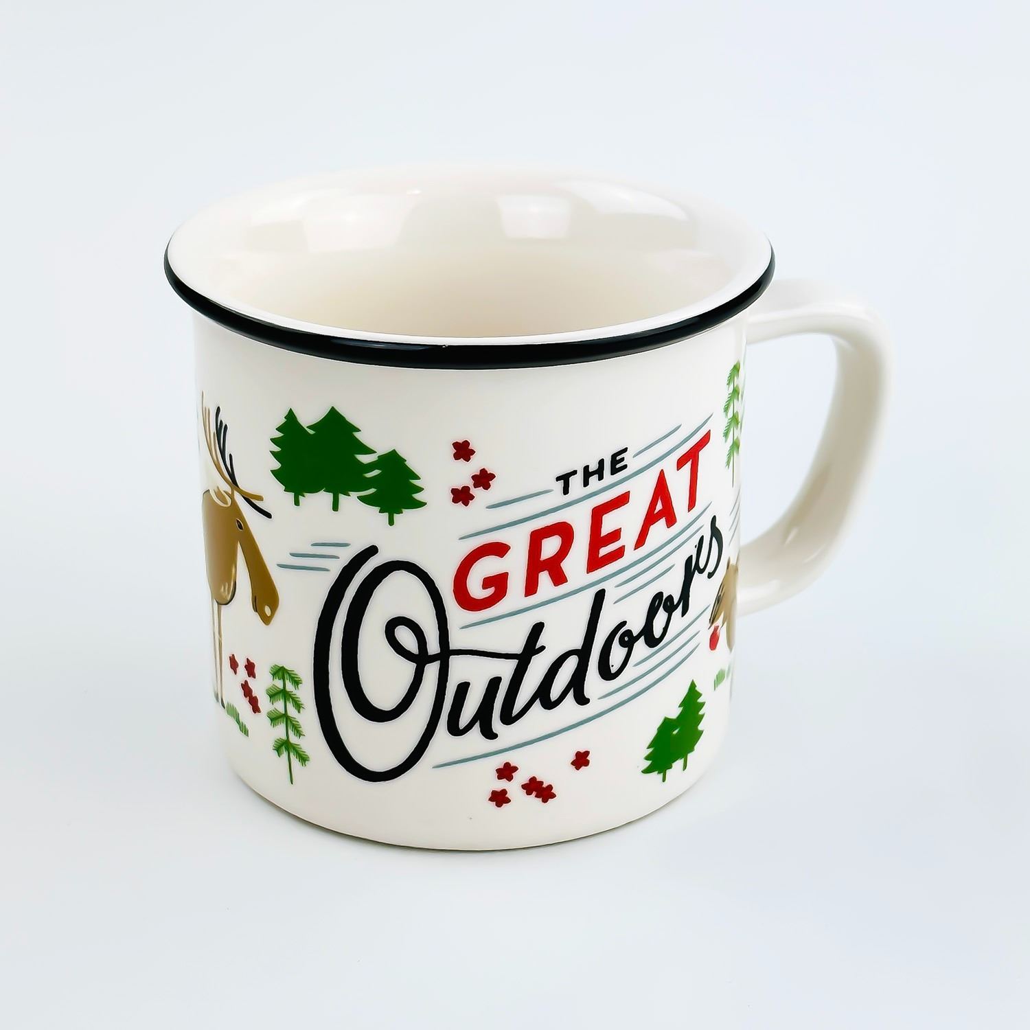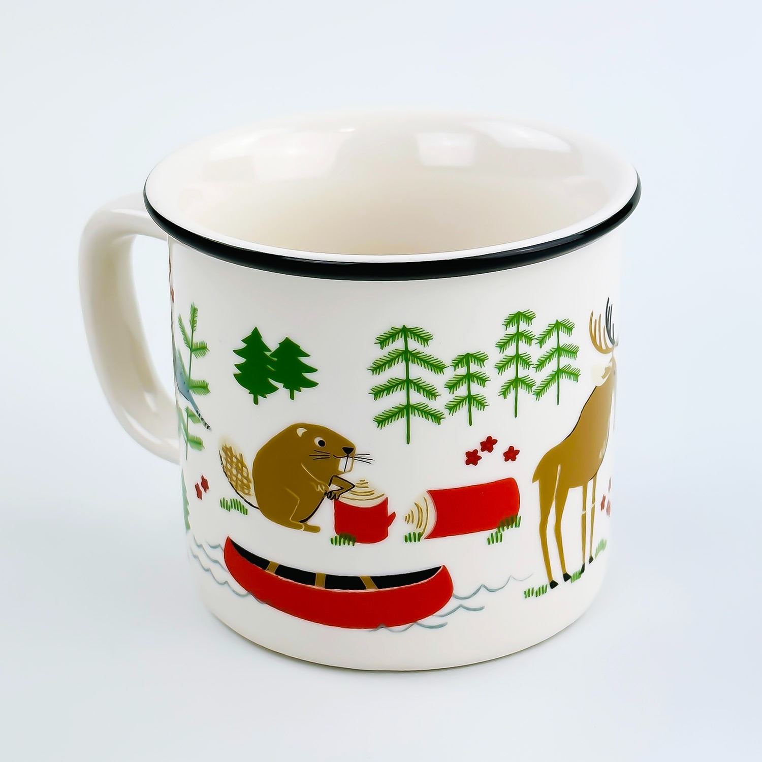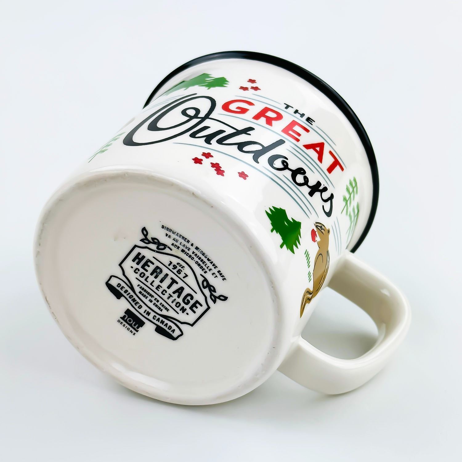 #8149 - HERITAGE COLLECTION COLLECTIBLE THICK WALLED COFFEE MUG CUP. THE GREAT OUTDOORS THEME - BEAVER, MOOSE, BIRD, TREES, CANOE ETC. MEASURES: 5” (12.5 CM) WIDE - INCLUDES HANDLE BY 3.75” (9.5 CM) TOP DIAMETER