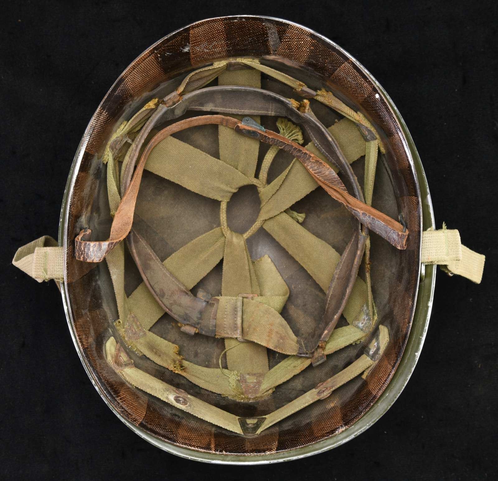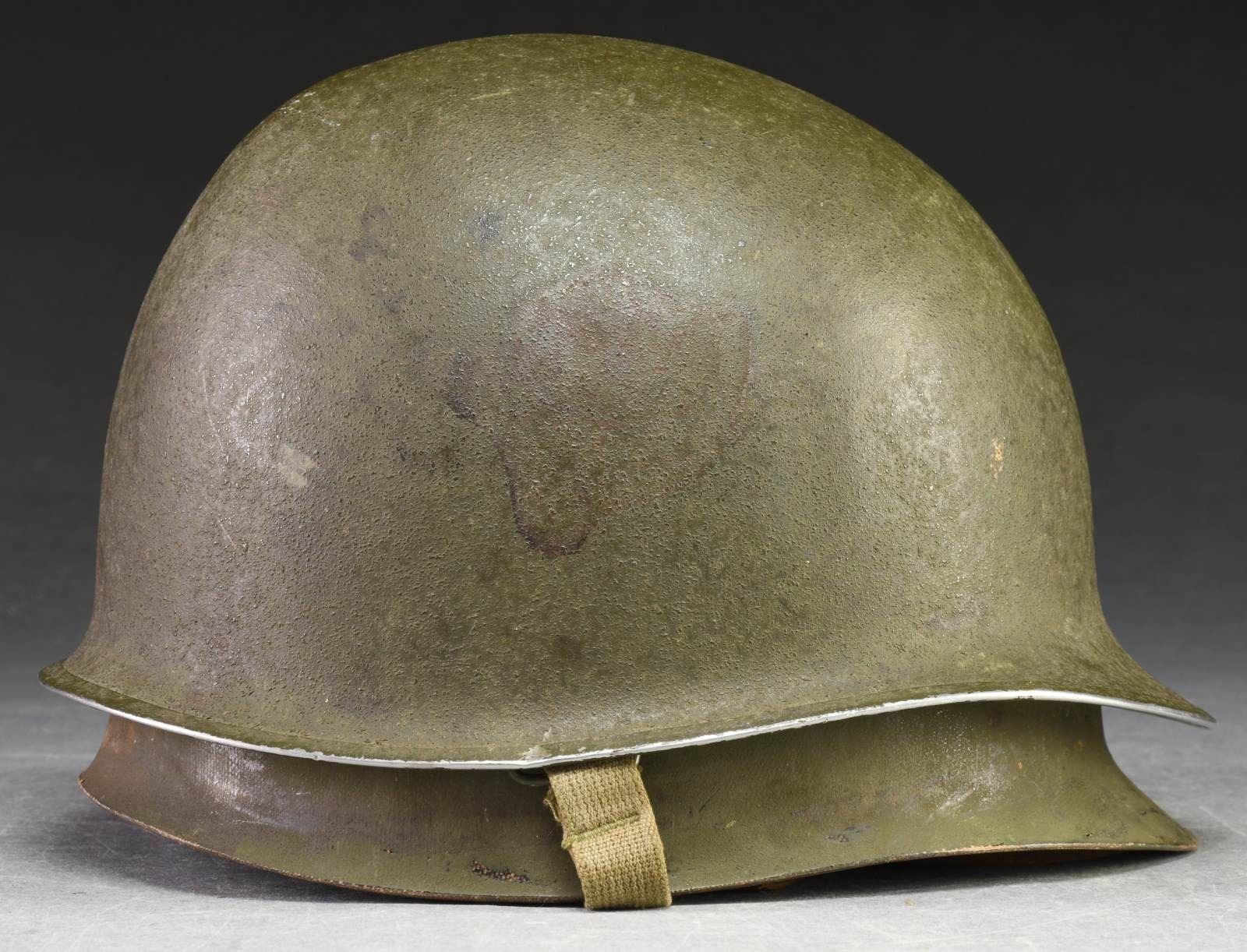 GROUP. This historic group belonged to Captain Garth D. Haddock USMC. Not only does it include his named Purple Heart in the original case with the award document, it also includes the helmet he was wearing when he received his head wound & his pilot's life vest. Captain Haddock's ship, L.S.T. 599, was lying at anchor at Kerama Retto of Okinawa when it was hit by a Kamikaze attack. Haddock received a significant head wound, as indicated by the helmet included in this lot. There is also a period photograph of the helmet with Haddock's life vest after the incident. The helmet is a front seam fixed bail helmet with appropriate liner & chinstrap. The lot further includes Captain Haddock's Officer's visor cap, his nylon flight suit, and an autographed photo of Haddock with Pappy Boyington. There is a large group of ephemera from WWII and documents from Haddock's service. Lastly, his PAL survival knife is included in this fascinating lot. CONDITION: items generally show light wear except as noted. PROVENANCE: from the Lifelong Collection of Glen E. Mattox. (02-18564/BF). $1,000-1,600.