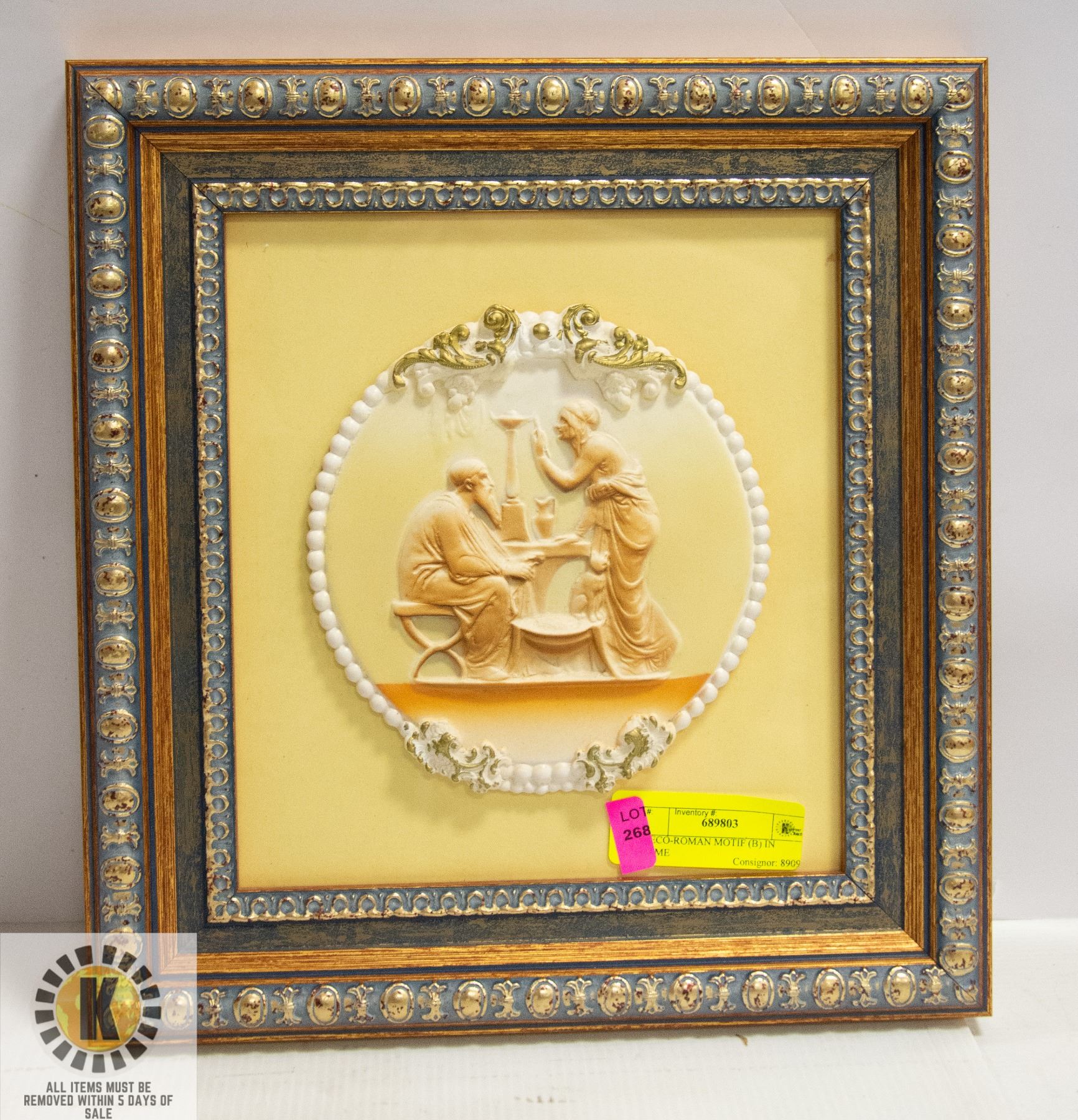 GRECO-ROMAN MOTIF IN WOODEN FRAME 12" X 13"ALL ITEMS MUST BE REMOVED WITHIN 5 DAYS OF SALE