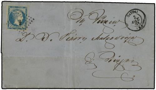 Vl.4 1861 20 l. azul usado en PATRAS. Fechador 2-OCT-1861 SEGUNDO DIA DE CIRCULACION. MAGNIFICA Y MUY RARA.