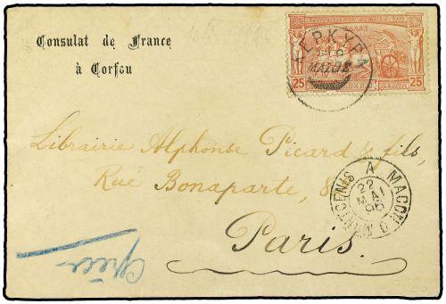 1896 Cover from French Consul in Corfu to Paris franked by Olympic 1896 25l red tied by Kerkyra (Corfu) cds in black. Mont Cenis A Macon transit also on front (May 22). Scott 122.