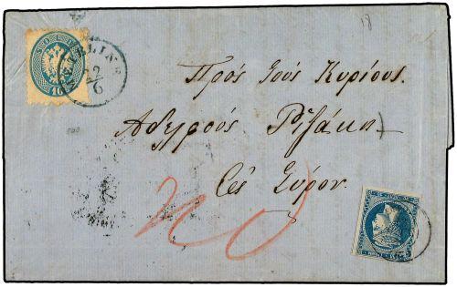 1865 Entire letter to SYROS franked by 1864 perf 9 10 s. blue tied by METELINE AUSTRIAN PO cds in blue; taxed on arrival with four margined 2 nd. Athens 20 L. blue tied by SYROS cds. Transit cds of Lloyd Agency in Smirne on reverse of rare cover.
