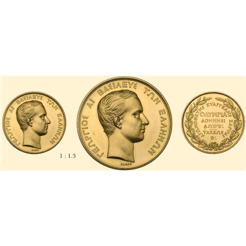 Gold medal 2nd Class (37mm, 30.09 g) by Barre for the coronation of the victors at the Olympic Games in 1870 in Athens, the first times the Olympics were held since antiquity. Head right / Legend between laurel branches.