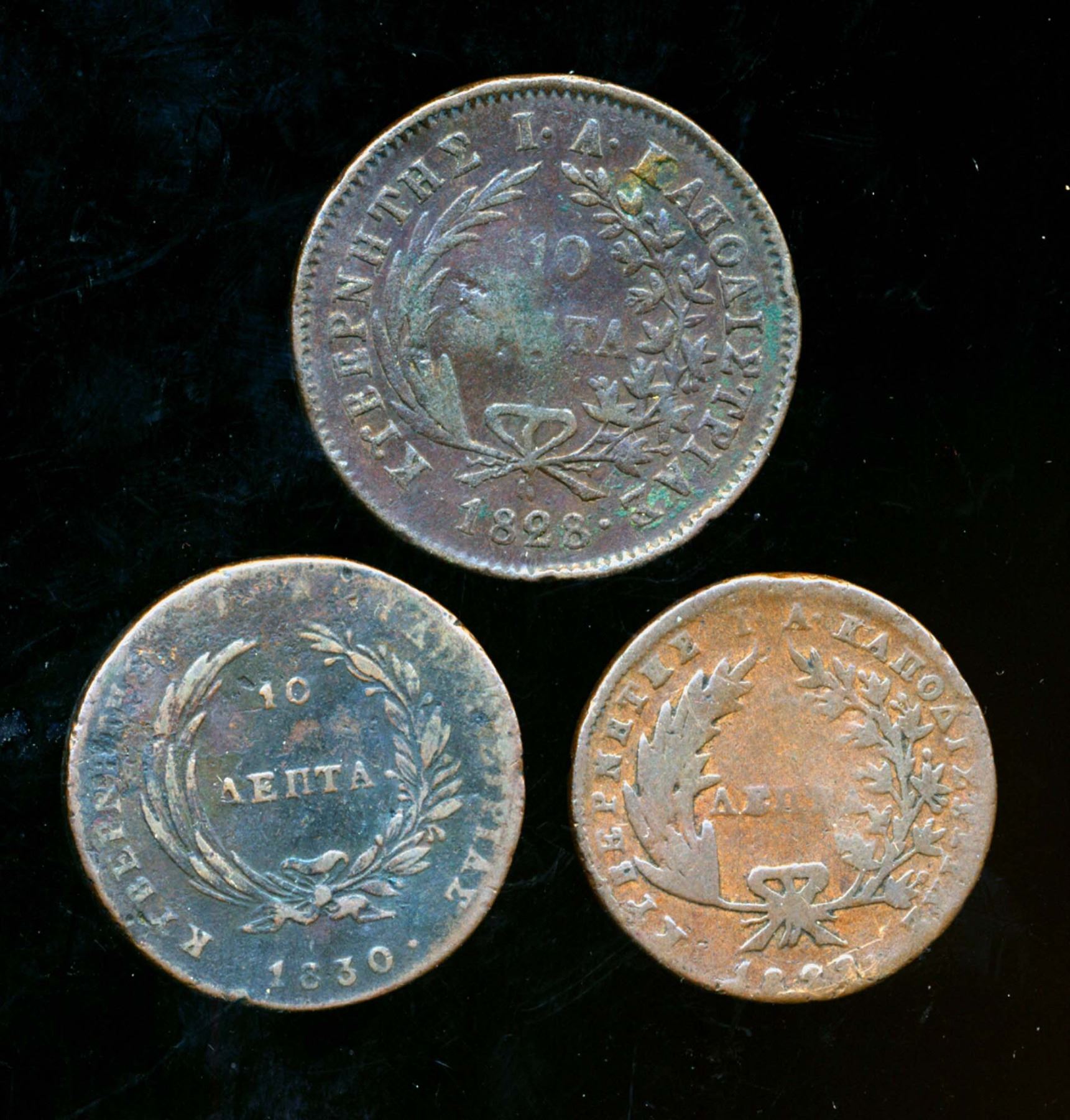 GREECE REPUBLIC 1828-1830 1828 Lepton VG+, 1828 10 Lepton F, 1830 10 Lepton F.