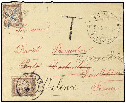 1906 Stampless cover to FRANCE cancelled on despatch with SALONIQUE-2 Turkish PO cds in black, large T marking and, on arrival charged Postage Due with 1895 2x 50 c. dull claret Postage Dues applied and tied by crayon cross and VALENCE arrival cds¦s. SG D306.