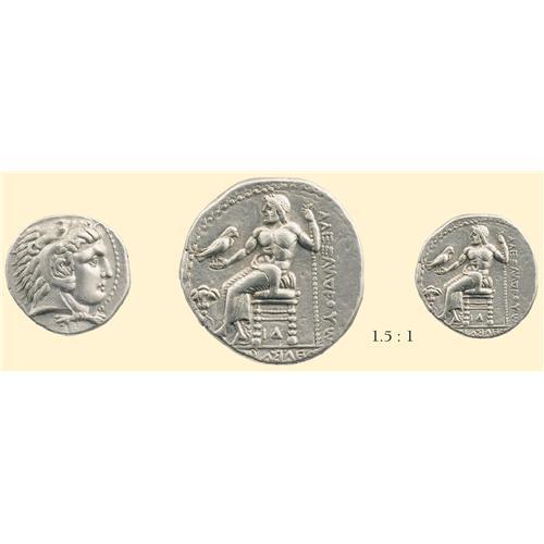 AR Tetradrachm (16.88 g). Memphis. 332-323 BC. Head of young Herakles right, wearing lion skin / <SPAN STYLE=`FONT-SIZE:10.0PT;FONT-FAMILY:SYMBOL;COLOR:#333333`>ALEXANDROU BASILEW-S</SPAN>, Zeus enthroned left, holding eagle and scepter, rose to left, <SPAN STYLE=`FONT-SIZE:10.0PT;FONT-FAMILY:SYMBOL;COLOR:#333333`>ID</SPAN> below throne. Price 3970 var. This appears to be an unusual variant of the Alexanders of Memphis bearing a rose and the name of <SPAN STYLE=`FONT-SIZE:10.0PT;FONT-FAMILY:SYMBOL;COLOR:#333333`>DIO</SPAN>. In this case the O is omitted from the retrograde rendering of the name, and the royal title is added below in the exergue.