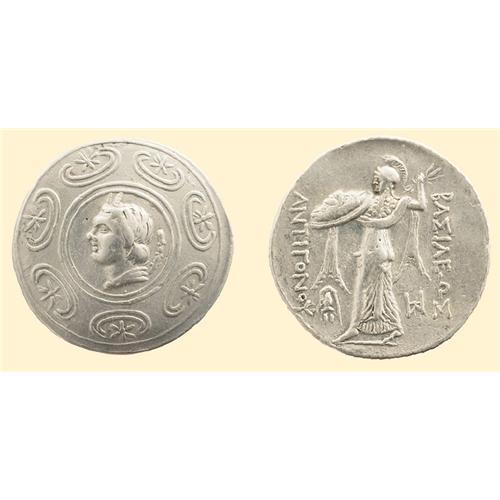 AR Tetradrachm (17.01 g). Head of Pan left, in center of Macedonian shield / <SPAN STYLE=`FONT-SIZE:10.0PT;FONT-FAMILY:SYMBOL;COLOR:#333333`>BASILEWS ANTIGONOU</SPAN>, Athena Alkidemos advancing left, helmet to left, monogram to right. SNG Alpha Bank 986-988. SNG Ash. 3259. SNG Cop. 1199.