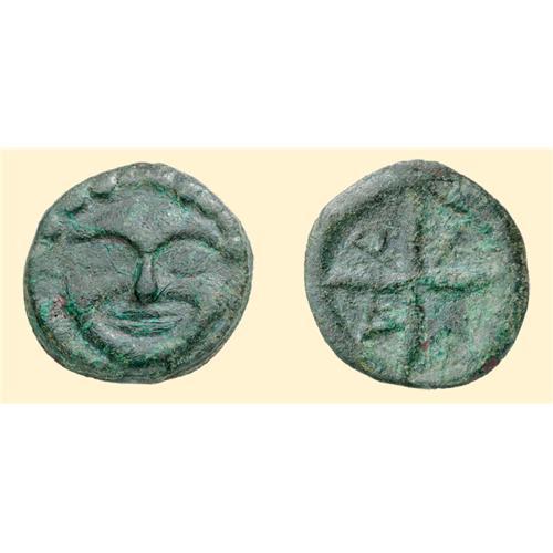 AE (11.92 g). 5th-4th c BC. Gorgon head facing / A-R-I-X between rays of wheel. SNG BM 387.