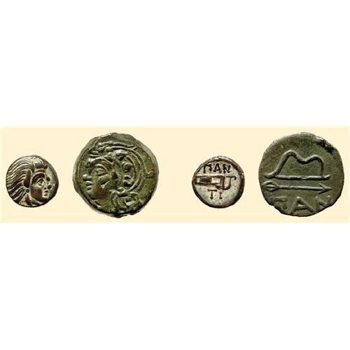 Pair of Pantikapaion bronzes, including an AE 20 (6.58 g), head of Pan, wearing ivy wreath to left / <SPAN STYLE=`FONT-SIZE:10.0PT;FONT-FAMILY:SYMBOL;COLOR:#333333`>PAN</SPAN>, bow above arrow, together with an AE 13 (2.14 g), head of Pan right / <SPAN STYLE=`FONT-SIZE:10.0PT;FONT-FAMILY:SYMBOL;COLOR:#333333`>PAN-TI</SPAN>, bow and quiver.
