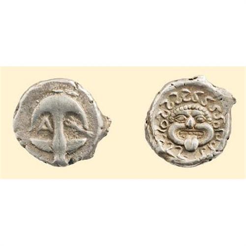 AR Drachm (3.27 g). 5th-4th century BC. Anchor with A and crayfish inside arms / facing Gorgon head. SNG BM 159 ff.