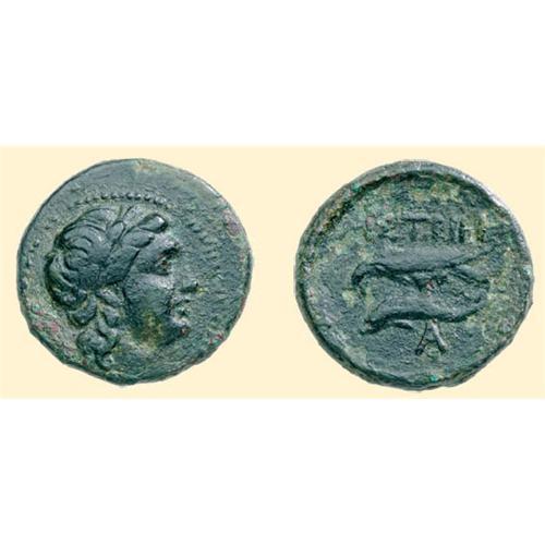 AE 20 (6.61 g). Ca. 350-250 BC. Laureate head of Apollo right / <SPAN STYLE=`FONT-SIZE:10.0PT;FONT-FAMILY:SYMBOL;COLOR:#333333`>ISTRIH</SPAN>, eagle left, holding dolphin in talons; monogram A below. AMNG I/1, 459 var.; SNG BM -.