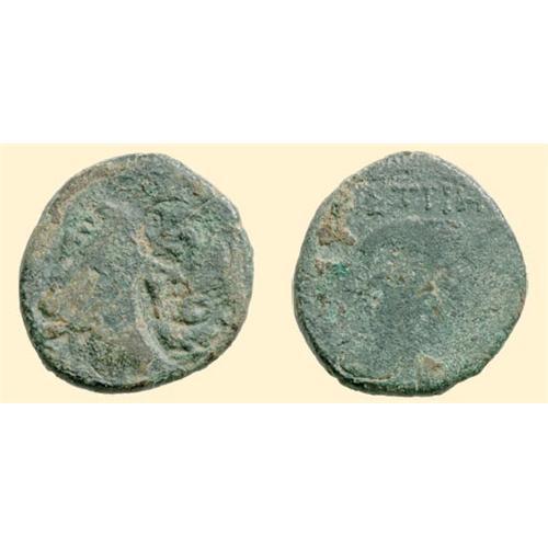 AE 22 (7.09 g). Ca. 150-beginning of the 1st century BC. Head of Dionysos right / <SPAN STYLE=`FONT-SIZE:10.0PT;FONT-FAMILY:SYMBOL;COLOR:#333333`>ISTRIH</SPAN> [...]. AMNG I/1 - ; BMC -. Applied to the obverse is a countermark with a laureate head right.