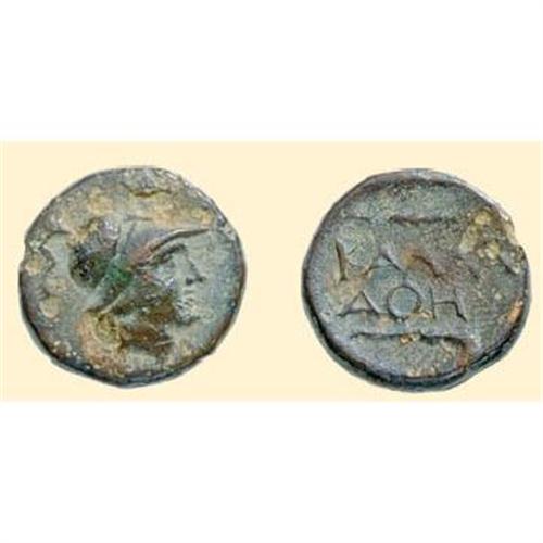 AE 13 (2.19 g). Second half of the 2nd-first half of the 1st century BC. Helmeted head of Athena right / <SPAN STYLE=`FONT-SIZE:10.0PT;FONT-FAMILY:SYMBOL;COLOR:#333333`>KALLA / AQH</SPAN> between wheat blade and club. AMNG I/1, 244; SNG BM 208; SNG Stancomb 100.