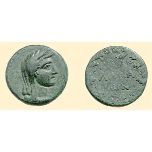 AE 20 (6.53 g). End of the 3rd-beginning of the 2nd century BC. Veiled head of Demeter right / <SPAN STYLE=`FONT-SIZE:10.0PT;FONT-FAMILY:SYMBOL;COLOR:#333333`>KAL/LATIA/NWN</SPAN> within laurel wreath. AMNG I/I - ; SNG BM - ; SNG Stancomb - ; Grose 4317.