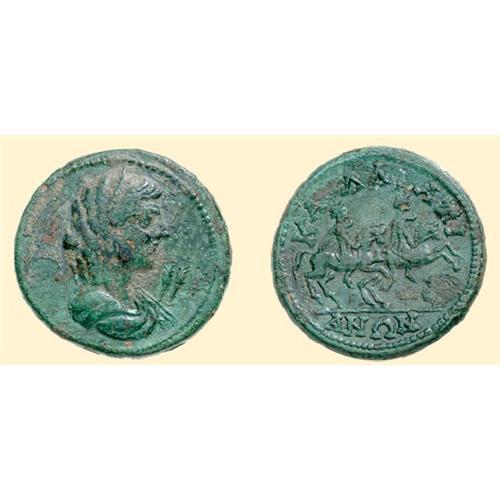 3 Assaria (7.48 g). End of the 2nd-beginning of the 3rd century AD. Diademed, veiled and draped bust of Demeter with blade of wheat right / <SPAN STYLE=`FONT-SIZE:10.0PT;FONT-FAMILY:SYMBOL;COLOR:#333333`>KALLATI/ANWN</SPAN>, Dioscurii on horseback right. AMNG I/1, 281; BMC 22, 9 var.; SNG Stancomb 865 var.