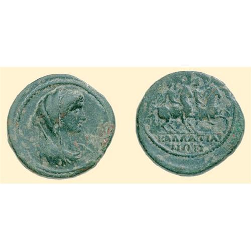 3 Assaria (6.41 g). End of the 2nd-beginning of the 3rd century AD. Diademed, veiled and draped bust of Demeter with blade of wheat right / <SPAN STYLE=`FONT-SIZE:10.0PT;FONT-FAMILY:SYMBOL;COLOR:#333333`>KALLATI/ANWN</SPAN> in exergue, Dioscurii on horseback right. . AMNG I/1, 282; BMC 22, 9 var.