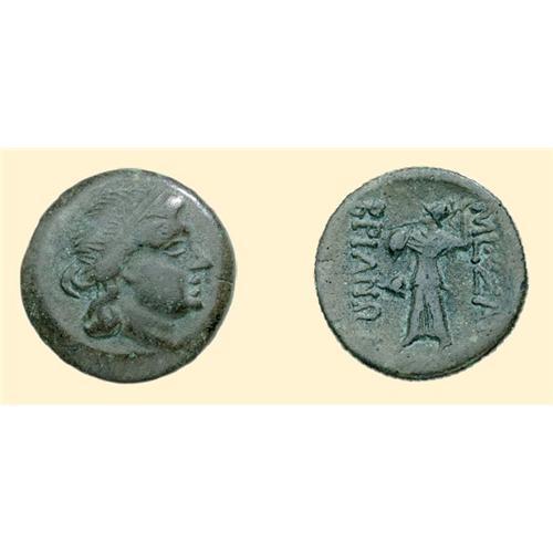 AE 20 (8.13 g). 2nd c BC. Diademed female head right / <SPAN STYLE=`FONT-SIZE:10.0PT;FONT-FAMILY:SYMBOL;COLOR:#333333`>MESSAM-BRIANWN</SPAN>, Athena Promachos left. SNG BM 285.