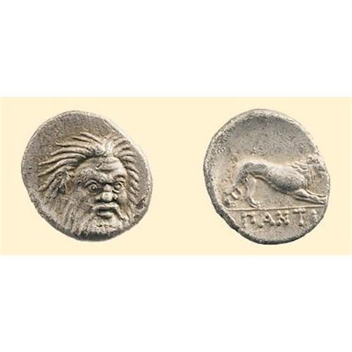 AR Hemidrachm (2.63g.). Ca. 370-355 BC. Head of Pan three-quarters facing / <SPAN STYLE=`FONT-SIZE:10.0PT;FONT-FAMILY:SYMBOL;COLOR:#333333`>PANTI</SPAN>, lion crouching right. MacDonald 41; SNG Stancomb 537; SNG BM Black Sea 862.
