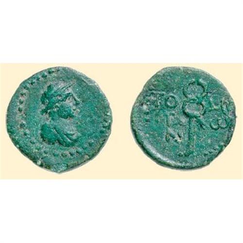 AE 16 (3.10 g). End of the 1st-beginning of the 2nd century AD. Draped bust of Hermes with petasus (?) right / <SPAN STYLE=`FONT-SIZE:10.0PT;FONT-FAMILY:SYMBOL;COLOR:#333333`>TO-MI/TA-W/N</SPAN>,? caduceus. AMNG I/2 - , cf. 2537.