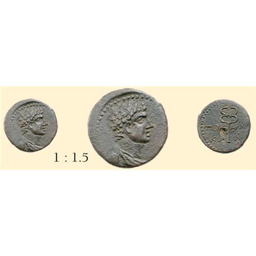 AE 14 (1.62 g). Ca. 220-240 AD. Draped bust of Hermes with small wing in hair / <SPAN STYLE=`FONT-SIZE:10.0PT;FONT-FAMILY:SYMBOL;COLOR:#333333`>TO-MI</SPAN> / <SPAN STYLE=`FONT-SIZE:10.0PT;FONT-FAMILY:SYMBOL;COLOR:#333333`>KA-L</SPAN>, winged caduceus. AMNG I/2, 2531 var.; BMC - ; SNG Stancomb - ; RPC 2, 409.