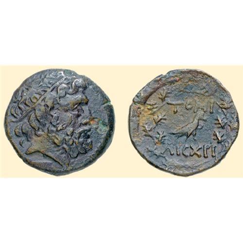 AE 24 (8.71 g). End of the 3rd-beginning of the 2nd century BC. Diademed and bearded head of divinity right / TOMI, eagle and AICXPI monogram within oak wreath. AMNG I/2, 2407; SNG BM 301-304 var.