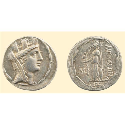 AR Tetradrachm (14.14 g). 30/29 BC. Turreted, veiled and draped bust of Tyche right / <SPAN STYLE=`FONT-SIZE:10.0PT;FONT-FAMILY:SYMBOL;COLOR:#333333`>AIGEAIWN</SPAN>, Athena standing right, holding Nike, lance and shield, <SPAN STYLE=`FONT-SIZE:10.0PT;FONT-FAMILY:SYMBOL;COLOR:#333333`>DI</SPAN> and club left, <SPAN STYLE=`FONT-SIZE:10.0PT;FONT-FAMILY:SYMBOL;COLOR:#333333`>IZ</SPAN> (=year 17) below, <SPAN STYLE=`FONT-SIZE:10.0PT;FONT-FAMILY:SYMBOL;COLOR:#333333`>D</SPAN> right field bottom, all within wreath. Houghton-Bendall, ANSMN 33, p. 73; SNG Levante 1656; SNG France 2,-; BMC-.