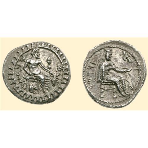 Datames, 378-372 BC. AR Stater (9.76g). Baaltars seated right, holding blade of wheat and grapes, bull protome on throne, all within crenelated wall / Datames, seated right, wearing a Persian cap and holding an arrow. Traite II, cf. 610; SNG France 2, 289.