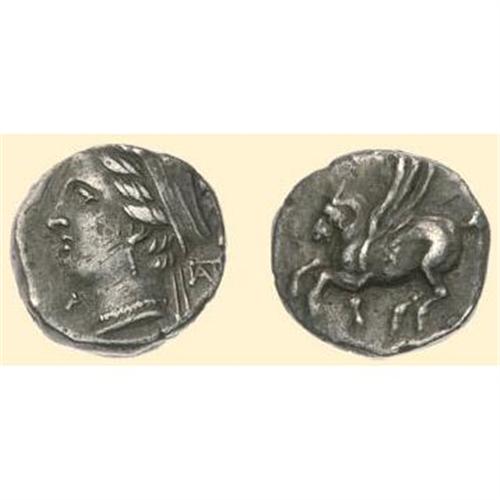 AR Drachm (2.62 g). Ca. 350-300 BC. Pegasus flying left / head of Aphrodite left, her hair tied by a ribbon. BMC 49, 407-409 var.