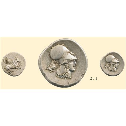 AR Stater (8.52 g.). 415-387 BC. Pegasus left / helmeted head of Athena right, wearing Corinthian helmet, rearing Chimaera behind. Ravel 532. A stunning coin.