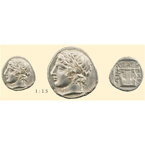 AR Tetradrachm (13.96 g). Olynthos. Ca. 420-410 BC. Laureate head of Apollo left / <SPAN STYLE=`FONT-SIZE:10.0PT;FONT-FAMILY:SYMBOL;COLOR:#333333`>C-A-L-KID-EWN</SPAN>, lyre, A above, all in incuse square. SNG Cop.-; SNG Ash.-; Boston-; Gulbenkian-.