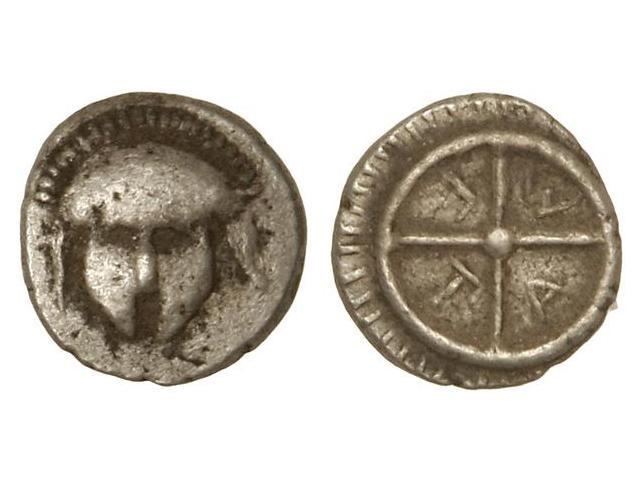 GREEK COINS - Dióbolo. 450-350 a.C. MESEMBRIA. Anv.: Casco crestado de frente. Rev.: META. En los cuatro cuarteles de una rueda. 1,30 grs. AR. Se-1673. MBC/MBC+.